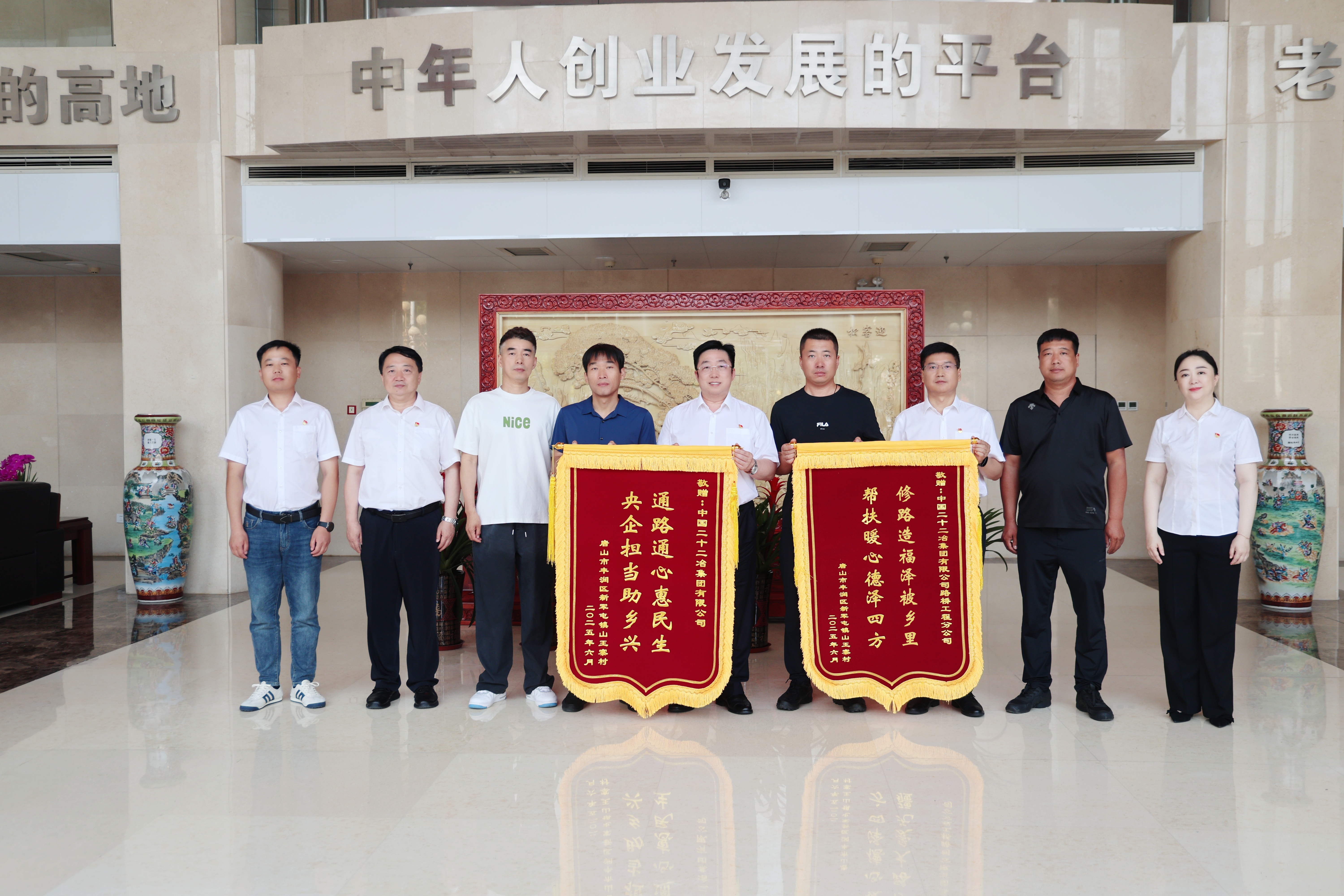 6月18日,唐山市總工會副主席付競楠一行來到中國二十二冶辦公大樓,將寫著“通路通心惠民生 央企擔當助鄉(xiāng)興”和“修路造福澤被鄉(xiāng)里 幫扶暖心德澤四方”的兩面錦旗送到了公司領導手中,表達對中國二十二冶路橋分公司傾力幫扶的深深謝意。