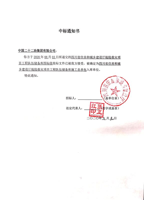 2020年8月9日,中國(guó)二十二冶集團(tuán)有限公司成都分公司收到四川省住房和城鄉(xiāng)建設(shè)廳“四川省住房和城鄉(xiāng)建設(shè)廳搶險(xiǎn)救災(zāi)項(xiàng)目工程隊(duì)伍儲(chǔ)備庫(kù)”項(xiàng)目中標(biāo)通知書,這標(biāo)志著成都公司正式進(jìn)入四川省住房和城鄉(xiāng)建設(shè)廳搶險(xiǎn)救災(zāi)項(xiàng)目工程隊(duì)伍儲(chǔ)備庫(kù)(施工總承包單位)。