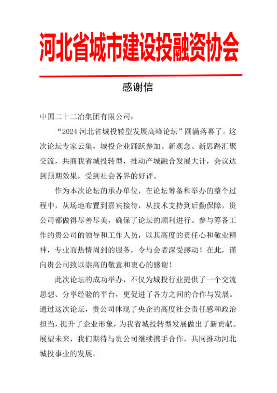 6月4日,投融資事業(yè)部收到河北省城市建設(shè)投融資協(xié)會感謝信,對事業(yè)部承辦“2024河北省城投轉(zhuǎn)型發(fā)展高峰論壇”活動并取得圓滿成功表示感謝。本次論壇以 “應(yīng)對新變化 破解新難題 增添新動能 再謀新發(fā)展”為主題,旨在促進(jìn)河北省城投公司實(shí)現(xiàn)市場化、產(chǎn)業(yè)化的轉(zhuǎn)型,70余家河北省城投公司、50余家咨詢單位及金融機(jī)構(gòu)代表;協(xié)會相關(guān)領(lǐng)導(dǎo)、行業(yè)內(nèi)專家;中國二十二冶集團(tuán)相關(guān)領(lǐng)導(dǎo)共計(jì)200余人參加會議。受到了中國房地產(chǎn)報(bào)、河北電視臺、河北工人報(bào)、唐山電視臺、唐山勞動日報(bào)、長城網(wǎng)等各大媒體報(bào)道。