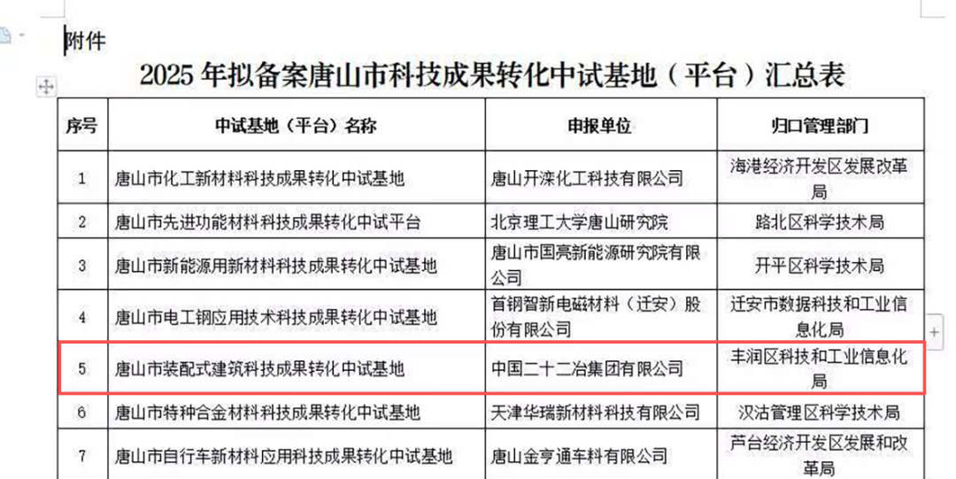近日,經(jīng)唐山市科學(xué)技術(shù)局審核與公示,由裝配式公司牽頭申報(bào)的“唐山市裝配式建筑科技成果轉(zhuǎn)化中試基地”成功入選2025年度唐山市科技成果轉(zhuǎn)化中試基地示范(平臺(tái)),標(biāo)志著公司在裝配式建筑領(lǐng)域的科研實(shí)力與成果轉(zhuǎn)化能力獲得市級(jí)認(rèn)可與支持。