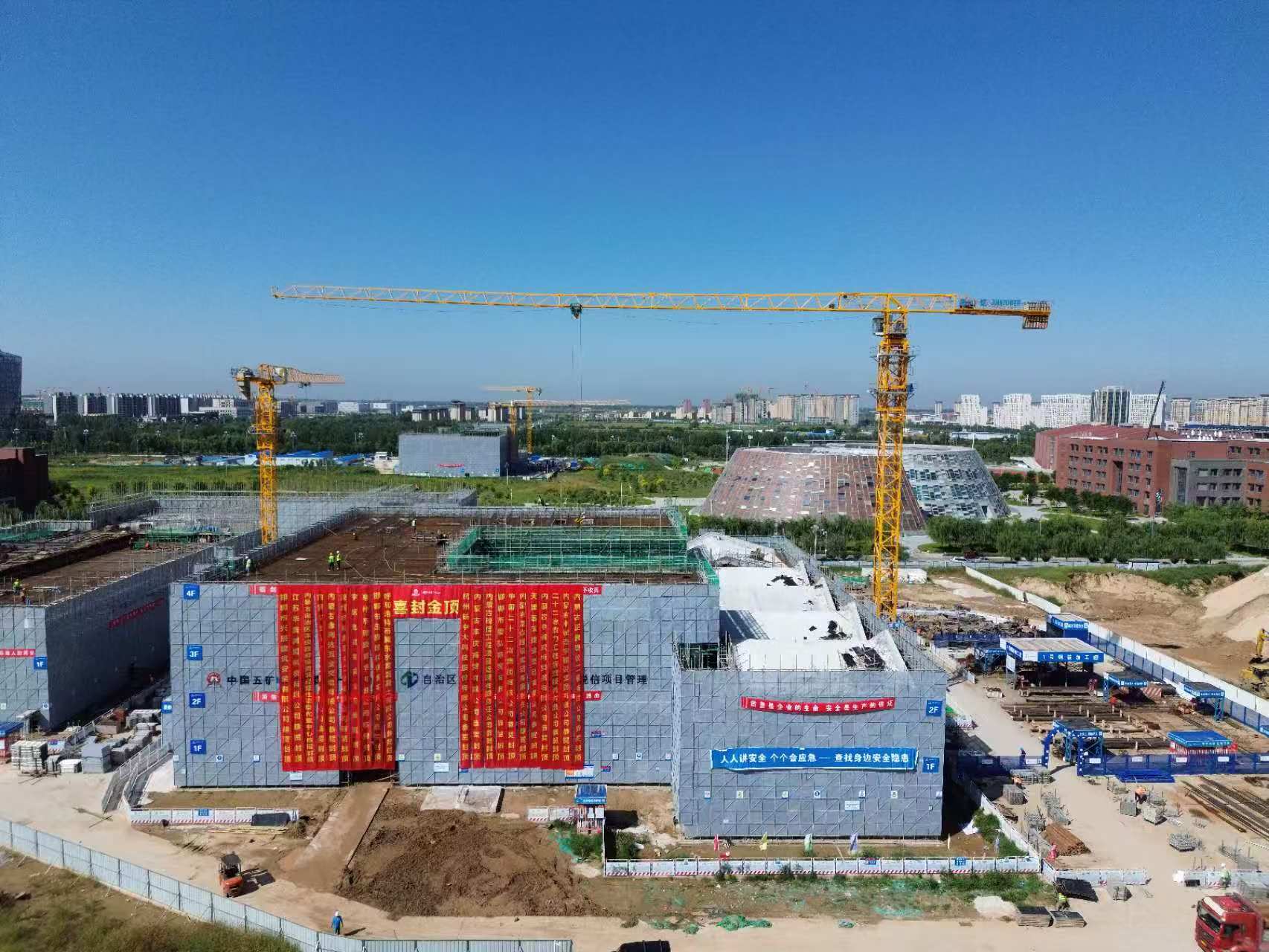 8月25日,一公司內(nèi)蒙古藝術(shù)學(xué)院新校區(qū)建設(shè)項目影視系教學(xué)樓及音樂系教學(xué)樓A、B區(qū)主體結(jié)構(gòu)封頂,標志著項目正式進入二次結(jié)構(gòu)施工階段。